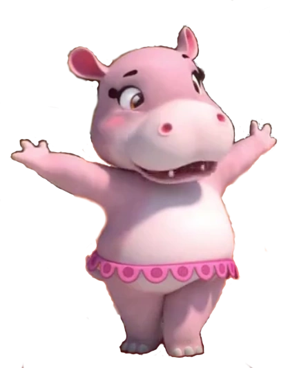 Маленький гиппопотам розового цвета. Глаза красновато-розовые. Морда и живот светлые, почти белые. Мара носит розовую юбку.